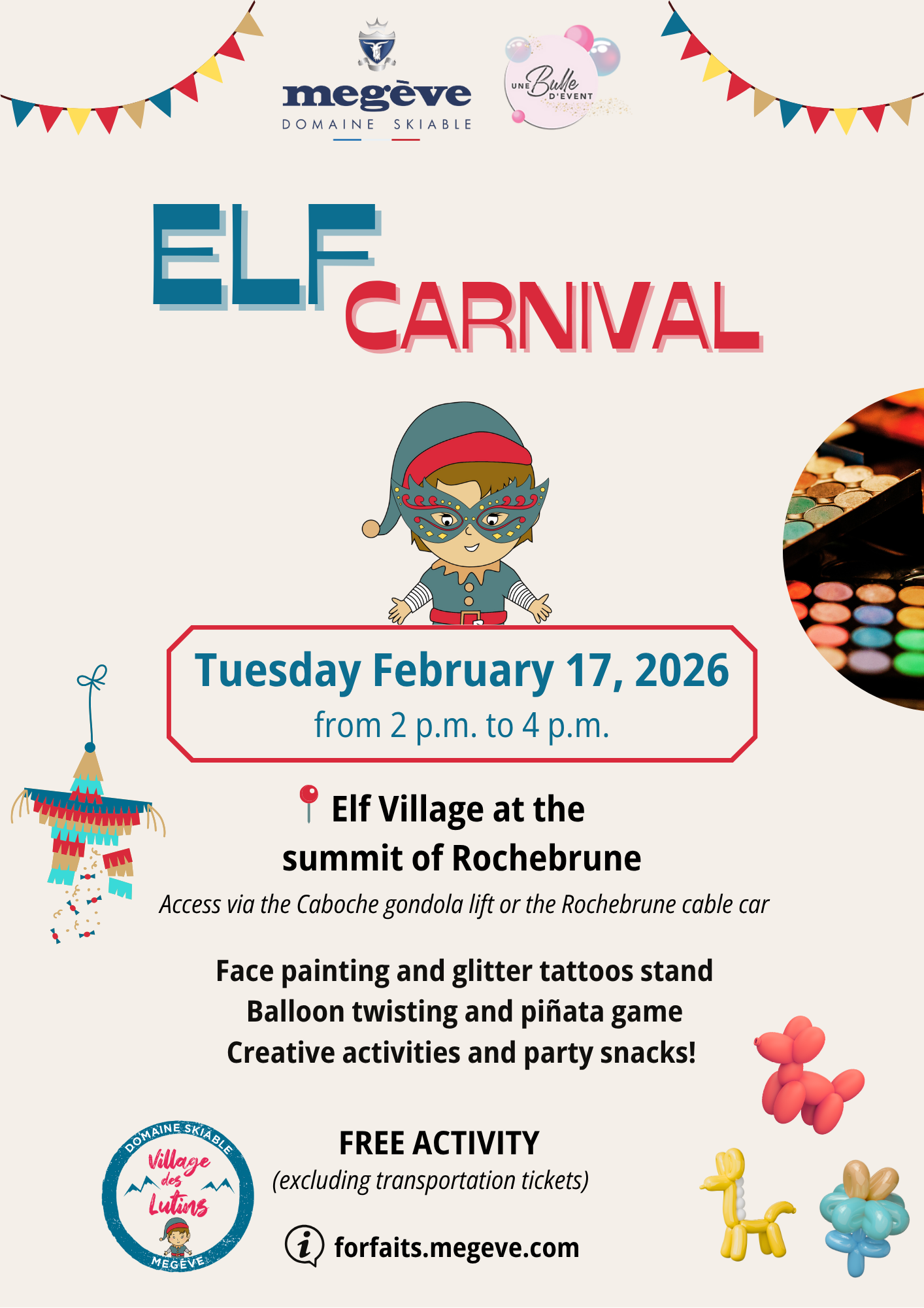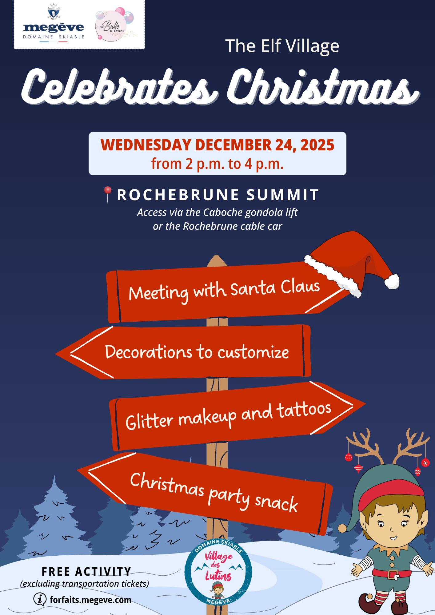 The Elf Village is celebrating Christmas. On the agenda: a meeting with Santa Claus, customizable hanging decorations, glittery face painting and tattoos, and the traditional Christmas snack!